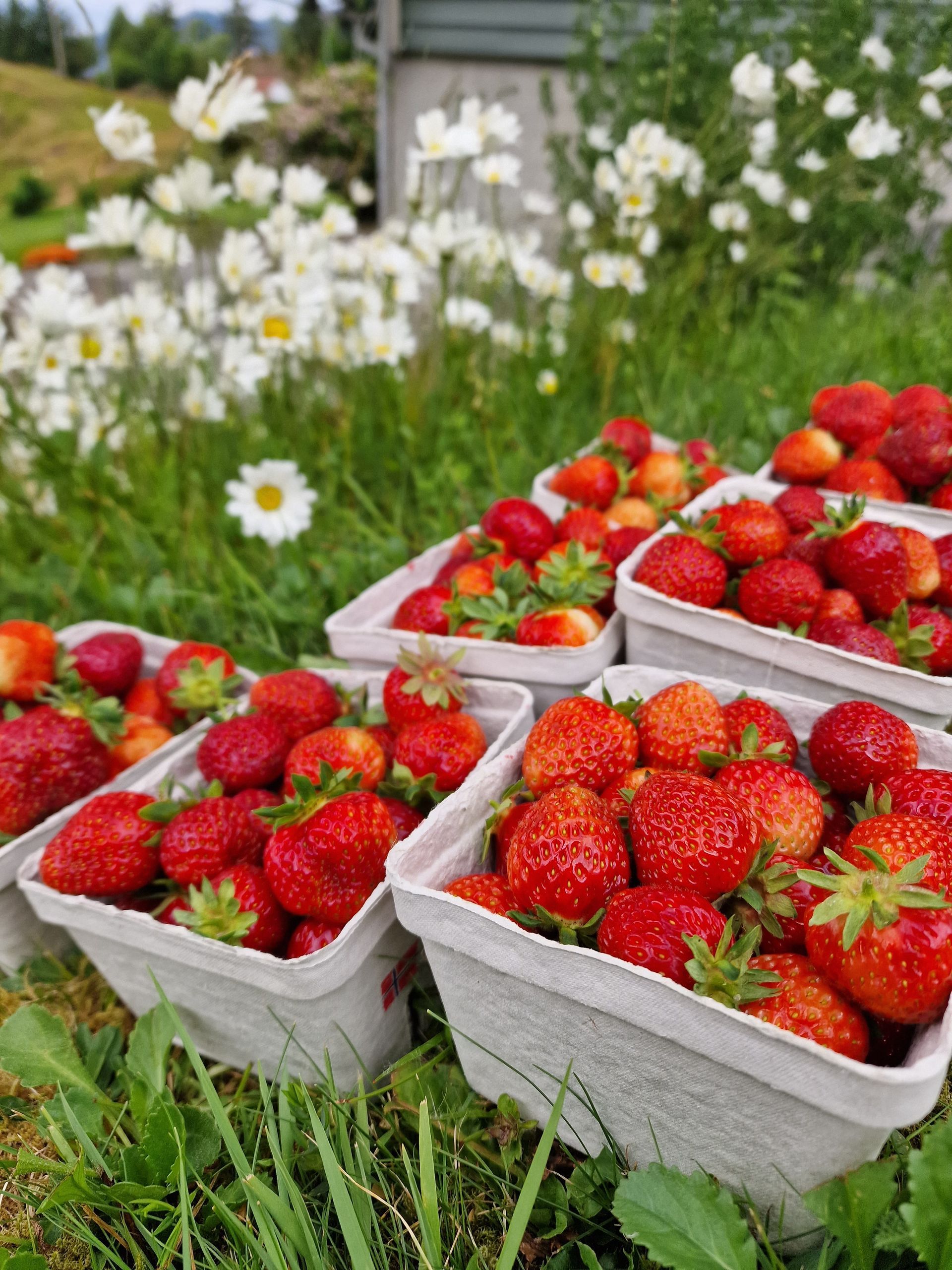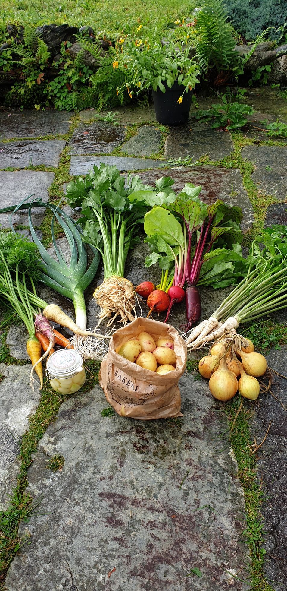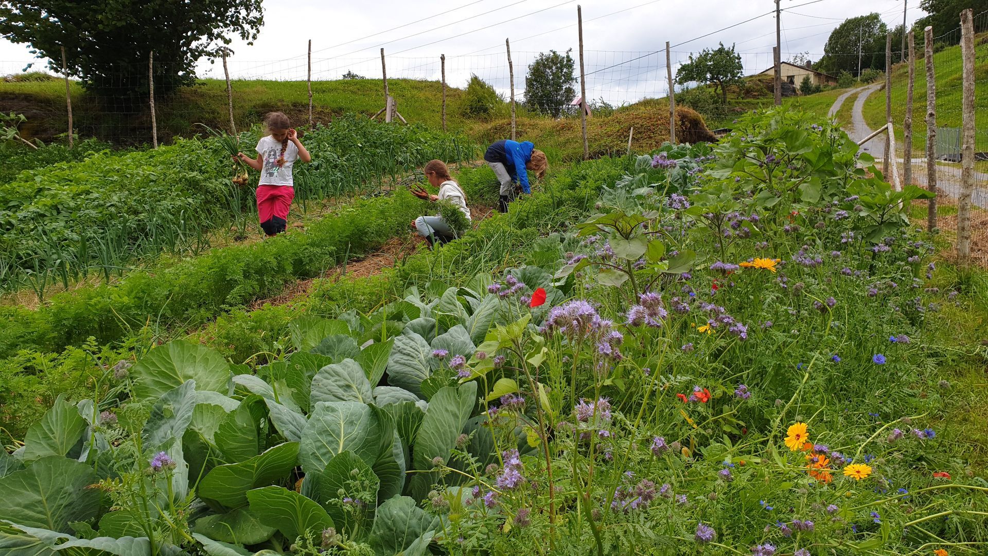I kjøkenhagen har me alt frå, gulrøter, kålrot, poteter, jordbær, kål, paprika, tomatar, agurk, løk og chili, kvitløk, salat, reddikar, sellerirot, urter og mykje meir.